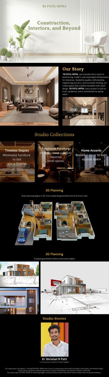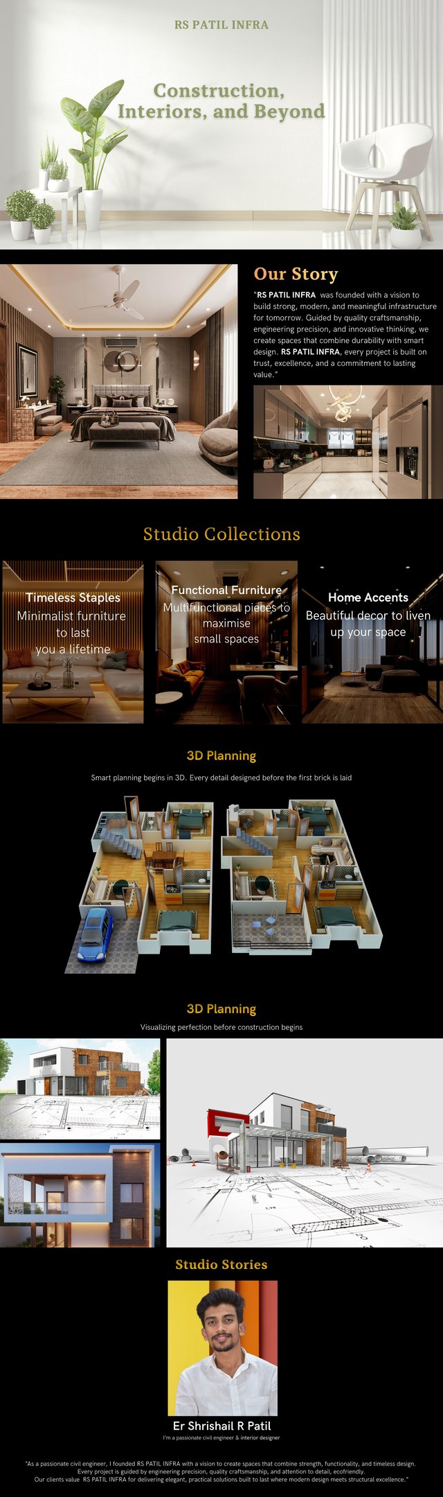 RS PATIL INFRA is a trusted Construction, infrastructure, and Real estate firm providing end-to-end solutions in residential and commercial construction, project estimation, and Government & Private tenders. We also offer Vastu-compliant planning and 3D interior & exterior designs. Committed to quality, transparency, timely delivery, and professional integrity, we deliver reliable and value-driven projects.